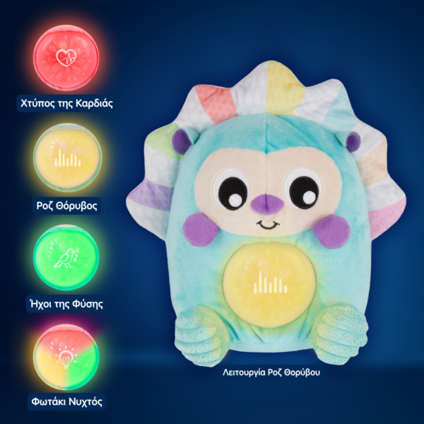 Με χρόνο αναπαραγωγής ήχου 90 λεπτών, ο Σκαντζόχοιρος επαναρυθμίζεται όταν επιλέγεται ένας νέος ήχος. Αυτός ο αξιολάτρευτος Σκαντζόχοιρος που διαθέτει εξαιρετικά μαλακό σώμα για αγκαλιές, αγκάθια για απτική εξερεύνηση και ύφασμα από χοντρό κοτλέ προσφέρει επίσης παρηγοριά με το άγγιγμα.  Ο Σκαντζόχοιρος Ύπνου με Χαλαρωτικούς Ήχους και Φώτα είναι κατάλληλος από την γέννηση του βρέφους, προωθεί την θετική εκπαίδευση ύπνου στα νέα βρέφη και βοηθά στην ενίσχυση της ρουτίνας ύπνου στα νήπια.  Ένα όνειρο για τα βρέφη και τους γονείς.